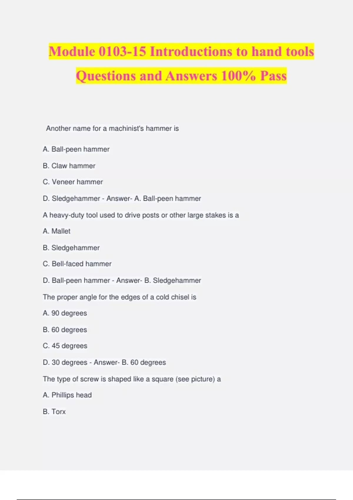 *Module 0103-15 Introductions to hand tools Questions and Answers *